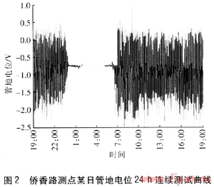 綜合上述調(diào)查內(nèi)容,完成了《僑香路燃?xì)夤艿离s散電流干擾腐蝕控制預(yù)備性測試報告》。圖2是測試報告中的某日管地電位24h連續(xù)測試曲線。