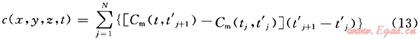 令t1=0,tN=t’,當(dāng)時(shí)間較短時(shí),取N=1000足可以滿(mǎn)足工程計(jì)算精度需求。則對(duì)任意時(shí)刻任意點(diǎn)處的濃度計(jì)算式為: