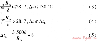 在計(jì)算極限狀態(tài)溫差時(shí),若管道最大循環(huán)溫差不超過極限狀態(tài)溫差,錨固段的直管段不會(huì)發(fā)生局部屈曲。管道的極限狀態(tài)溫差和臨界徑厚比Rm/δ有關(guān),當(dāng)管徑確定,鋼管的壁厚越薄,越容易發(fā)生局部屈曲。最大循環(huán)溫差的極限狀態(tài)為: