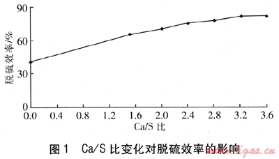 ① 鍋爐爐內(nèi)脫硫效率隨著Ca/S比的增大而提高。在Ca/S比較小時,脫硫效率隨著Ca/S比的增大而迅速提高;當Ca/S比達到一定值以后,脫硫效率提高得很緩慢,并且趨于一穩(wěn)定值。