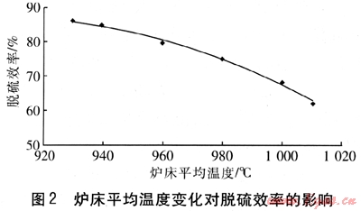 ② 爐床溫度對脫硫效率影響顯著。隨著爐床溫度的上升,脫硫效率幾乎呈線性下降。