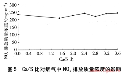 ⑤ 石灰石脫硫?qū)煔庵蠳0x的排放質(zhì)量濃度影響不明顯。本試驗中N0x的排放濃度維持在200~240mg/m3,有很小的上升趨勢。