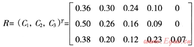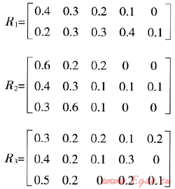 首先對U集中Ui作單因素評判,從因素Ui來確定評語集Vj(j=1,2,3…,m)的隸屬度rij,這樣就得到一個(gè)Ui的單因素評判集Ri={ri1,ri2,ri3,…,rim},R就反應(yīng)了U、V之間存在的某種模糊約束關(guān)系: