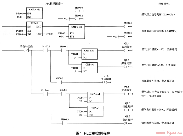 自動(dòng)系統(tǒng)需要4個(gè)開關(guān)量信號(hào):燃?xì)膺M(jìn)口壓力開關(guān)信號(hào)(動(dòng)作值12MPa);二級(jí)調(diào)壓器前后差壓開關(guān)信號(hào)(動(dòng)作值0);燃?xì)獬隹跍囟刃盘?hào)(動(dòng)作值20℃);燃?xì)獬隹跍囟刃盘?hào)(動(dòng)作值5℃)。輸入開關(guān)量信號(hào)采用原系統(tǒng)自有的模擬量輸入信號(hào)(一級(jí)調(diào)壓器前壓力和燃?xì)獬隹跍囟?,通過PLC控制程序(比較模塊)實(shí)現(xiàn)3個(gè)開關(guān)量信號(hào)。輸出信號(hào)有2個(gè):旁通閥開啟信號(hào),旁通閥關(guān)閉信號(hào)。