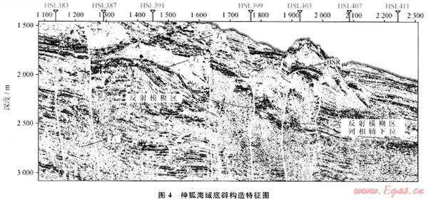 底辟構(gòu)造和天然氣水合物的形成與運(yùn)移聚集也有密切的關(guān)系,底辟構(gòu)造由地球深部物質(zhì)上拱或刺穿到淺部產(chǎn)生,在形成過(guò)程中會(huì)引起構(gòu)造側(cè)翼和頂部沉積層的傾斜和破裂,促使流體的排放,因而對(duì)水合物的形成十分有利。大量的調(diào)查資料顯示[14~15]:珠江口盆地白云凹陷中心有大量底辟群的存在,在神狐海域前期調(diào)查中,識(shí)別出了5個(gè)泥底辟異常反射體,其中4個(gè)位于白云凹陷內(nèi)。這些識(shí)別出來(lái)的底辟構(gòu)造在高分辨率地震剖面上表現(xiàn)特征主要為地震反射模糊區(qū)(帶),橫向上反射同相軸的連續(xù)性變差或錯(cuò)斷,內(nèi)部反射較雜亂,甚至為空白反射,局部見同相軸下拉現(xiàn)象;其兩側(cè)、頂部常見亮點(diǎn)振幅異常,白云凹陷北坡鉆井已揭示這種亮點(diǎn)與氣層存在良好對(duì)應(yīng)關(guān)系。因此,推斷這種反射模糊區(qū)應(yīng)為流體作用的結(jié)果(圖4)[16]。底辟構(gòu)造的存在說(shuō)明凹陷中心曾經(jīng)孕育著高壓、超壓系統(tǒng)。由于現(xiàn)今地層具有正常壓力,這說(shuō)明超壓的累積和釋放與深部烴源巖生烴及排烴有一定的關(guān)系。與底辟構(gòu)造密切伴生的大量亮點(diǎn)指示著沿底辟構(gòu)造的天然氣垂向輸導(dǎo),構(gòu)成了古近系油氣運(yùn)移到新近系 第四紀(jì)的成藏動(dòng)力系統(tǒng)。底辟構(gòu)造的發(fā)育在不同深度形成了上覆拱張,上覆地層產(chǎn)生了高角度的斷裂和垂向裂隙系統(tǒng),構(gòu)成流體運(yùn)移的另一個(gè)通道。