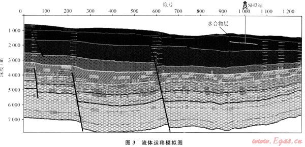 由于受區(qū)域構(gòu)造運(yùn)動(dòng),特別是新構(gòu)造運(yùn)動(dòng)的作用,神狐研究區(qū)內(nèi)斷裂構(gòu)造發(fā)育。斷層可分為北東、北西和北北西向3組,且均為正斷層,其中北東向斷層有明顯切割北西向斷層的趨勢(shì)。斷層活動(dòng)時(shí)間大致可分為晚中新世和上新世以來(lái)2個(gè)主要時(shí)期,晚中新世斷層以北西向?yàn)橹?,主要分布于研究區(qū)中北部,斷層大部分切割上中新統(tǒng),部分切穿上新統(tǒng),是研究區(qū)最主要斷層活動(dòng)時(shí)期;上新世以來(lái)活動(dòng)斷層以北東向?yàn)橹?,斷層活?dòng)強(qiáng)度小,但數(shù)量眾多。由于這些斷層貫通了下部氣源巖系與上部水合物形成的溫壓穩(wěn)定帶層系,改善了天然氣的垂向運(yùn)移條件,而斷層活動(dòng)時(shí)間又橫跨生氣和排氣高峰期,成為構(gòu)成流體運(yùn)移的一個(gè)主要通道。同時(shí),應(yīng)該注意到如果斷層過(guò)大,直通海底,會(huì)造成部分氣體的散失。從過(guò)SH2站位地震剖面流體運(yùn)移模擬結(jié)果來(lái)看(圖3),由于該處發(fā)育斷裂,直通海底,導(dǎo)致深部熱解氣源部分通過(guò)斷裂直通海底散失,未能有效運(yùn)移至水合物穩(wěn)定域,所以鉆井處熱解氣源對(duì)水合物貢獻(xiàn)較小。同時(shí)從圖中烴氣運(yùn)移方向分析,該處鉆遇的水合物主要為淺層生物成因氣通過(guò)橫向運(yùn)移至水合物穩(wěn)定域形成。