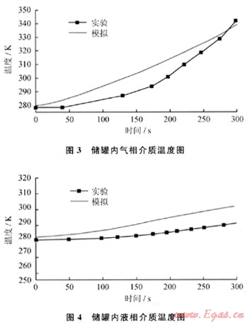 圖3、4分別為氣相介質(zhì)和液相介質(zhì)的溫度響應(yīng)過程,計算值與實驗值吻合較好,最大誤差分別為4.5%和4%。其中,氣相取距離儲罐頂部50mm處的介質(zhì)溫度,液相取距離儲罐底部200mm處介質(zhì)的溫度。由圖3和圖4對比可知,液相介質(zhì)的溫度升高較氣相介質(zhì)緩慢,300s內(nèi)氣相介質(zhì)和液相介質(zhì)的溫度分別升高了63K和11K。原因在于一方面蒸汽的比熱容遠小于液相的[2];另一方面液相介質(zhì)過熱后會通過相變將熱量轉(zhuǎn)化到氣相,使得液相介質(zhì)本身儲存的熱量較少。
