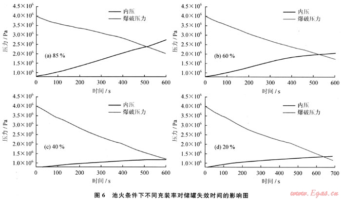 3) 池火作用下,LPG儲罐失效受到兩個因素控制,一是介質(zhì)溫度升高導(dǎo)致的儲罐內(nèi)介質(zhì)壓力升高,二是氣相區(qū)壁溫升高導(dǎo)致的強度下降。兩條曲線的交叉點即為儲罐的失效點。儲罐內(nèi)介質(zhì)的充裝率越高,儲罐失效時間越短。