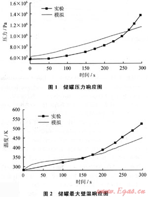 圖1、2所示分別為儲罐內(nèi)部壓力響應(yīng)過程和儲罐壁溫響應(yīng)過程。由圖1可見,池火災(zāi)作用下,儲罐壓力上升速度比較慢,原因在于均勻的池火與儲罐外壁間的對流換熱系數(shù)很小,主要依靠熱輻射作用傳熱;在300s左右,儲罐內(nèi)部壓力上升至安全閥的開啟值1.41MPa。圖2顯示儲罐最大壁溫的上升速度逐漸加快??傮w而言,圖1、2顯示的模擬值與實驗值基本吻合,壓力響應(yīng)和壁溫響應(yīng)的最大誤差分別為19%和14.3%,偏差產(chǎn)生的主要原因可能在于簡化的火焰輻射模型難以與真實火焰對儲罐外壁的加熱條件達到完全一致。