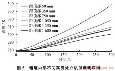 圖5所示為儲罐內(nèi)不同高度處介質(zhì)的溫度響應(yīng)規(guī)律??梢钥闯觯鼗鹱饔孟聝迌?nèi)部存在熱分層現(xiàn)象,溫度總體呈現(xiàn)上高下低的趨勢。本文所模擬的LPG儲罐的初始充裝率為72%,對應(yīng)的氣液分界面位于距儲罐頂部540mm處??梢?,氣相溫度明顯高于液相,且距離液面越遠氣相溫度越高,說明氣相除了通過相變吸熱外,還通過氣相壁面吸收輻射熱量;另外,在距離儲罐頂部1350mm以下的液相區(qū),介質(zhì)溫度降低明顯,說明過冷液體區(qū)與液相分層區(qū)[2]的分界面可能位于此處附近。