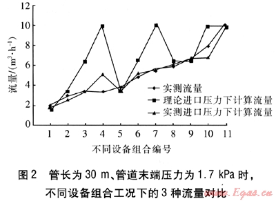 表3 管道末端壓力為1.7kPa時(shí),不同管道系統(tǒng)的理論進(jìn)口壓力下計(jì)算流量 m3/h