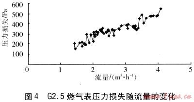 ③ 燃?xì)獗淼膲毫p失普遍超出廠家提供的值,部分型號(hào)甚至超出了國(guó)家檢定規(guī)程的要求。燃?xì)獗碓诮咏畲罅髁繒r(shí),壓力損失增加幅度更大,尤其是G2.5膜式表,在流量為4.08m3/h時(shí),壓力損失已達(dá)542Pa。故燃?xì)獗淼倪x型不應(yīng)只考慮量程范圍,還應(yīng)考慮量程范圍內(nèi)的壓力損失是否符合規(guī)范要求,以及大流量區(qū)間壓力損失增加幅度更大等因素。