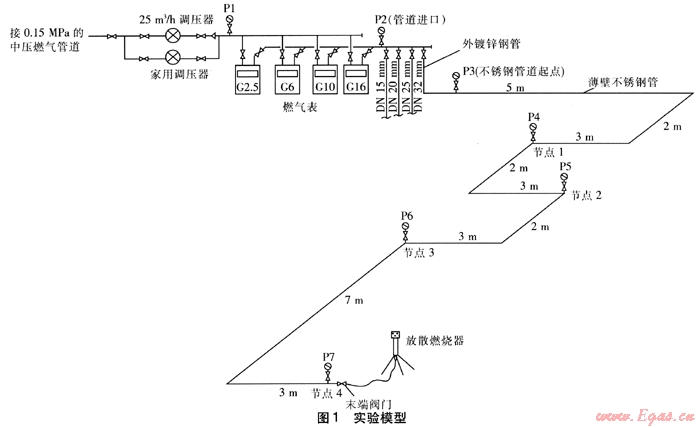 實(shí)驗(yàn)?zāi)P鸵妶D1。根據(jù)低壓燃?xì)夤艿赖牧髁坑?jì)算公式可知,當(dāng)管徑一定時(shí),管道中的燃?xì)饬髁恐慌c計(jì)算起點(diǎn)、終點(diǎn)間的壓力降有關(guān),與計(jì)算終點(diǎn)之后管道內(nèi)的壓力變化情況無(wú)關(guān)。