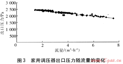 ② 調(diào)壓器出口壓力隨流量變化顯著,對(duì)于家用調(diào)壓器,為保證出口壓力不至于過(guò)低,應(yīng)控制其通過(guò)流量為理論最大流量的60%左右。對(duì)于25m3/h調(diào)壓器,因?yàn)槠涑隹趬毫烧{(diào),通過(guò)流量范圍可適當(dāng)放寬。