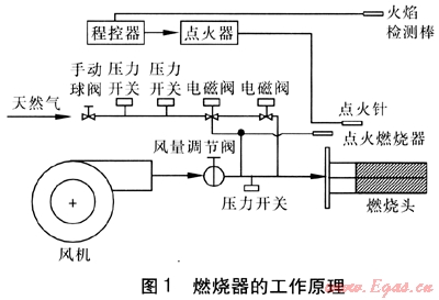為了滿足實(shí)際應(yīng)用的需要,選用比例閥控制及燃燒控制系統(tǒng),使其具備預(yù)吹掃、自動(dòng)點(diǎn)火、火焰檢測(cè)、熄火保護(hù)報(bào)警、燃?xì)飧叩蛪罕Wo(hù)、風(fēng)機(jī)故障保護(hù)、負(fù)荷可調(diào)等功能。燃燒器的工作原理見圖1。