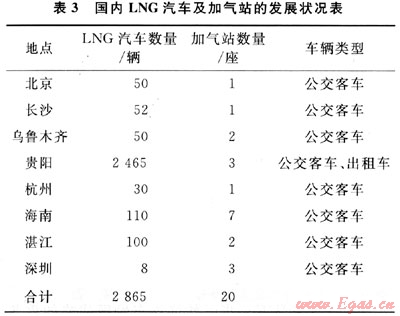 目前國內(nèi)只有北京、烏魯木齊、長沙、貴陽、海南等城市和地區(qū)進(jìn)行了LNG汽車技術(shù)示范應(yīng)用,并主要局限在公交車領(lǐng)域的應(yīng)用。據(jù)調(diào)查,截止到2009年12月全國僅有2800余輛LNG汽車運行,已建成的部分LNG加氣站情況如表3所示。