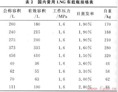 國內(nèi)現(xiàn)有多家LNG車載瓶制造企業(yè),如張家港富瑞特種裝備股份有限公司、四川空分設(shè)備(集團(tuán))有限責(zé)任公司、北京天海工業(yè)有限公司、張家港中集圣達(dá)因低溫裝備有限公司、哈爾濱深冷氣體液化設(shè)備有限公司、青島瑞豐氣體有限公司等。目前常見LNG車載氣瓶規(guī)格如表2所示。