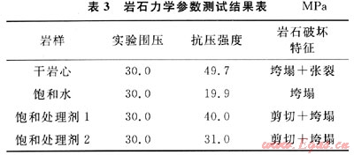 評價井壁穩(wěn)定處理劑綜合性能的重要方法之一就是測量對比飽和處理劑與飽和水的巖石力學(xué)參數(shù)變化。室內(nèi)采用聚合物處理劑浸泡過的泥巖巖樣進(jìn)行巖石力學(xué)參數(shù)測試。實驗結(jié)果見表3。