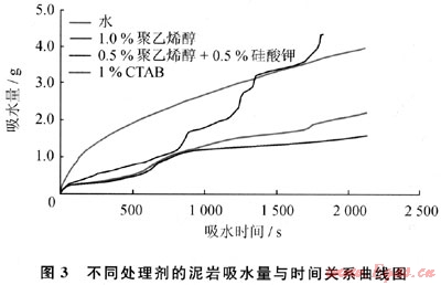 對比吸水量與時間關(guān)系曲線可知,泥巖在清水中的吸水量上升的最快,同一時間內(nèi)吸水量也最大。從總吸水量上來看,聚乙烯醇大于CTAB潤濕反轉(zhuǎn)劑,大于聚乙烯醇和硅酸鉀混合溶液,說明聚乙烯醇和硅酸鉀混合溶液的抗毛細(xì)管力自吸能力很好。CTAB潤濕反轉(zhuǎn)劑相對封堵型的處理劑,吸水量還是略高,抑制效果稍差。通過此項實驗,能有效地模擬評價處理劑抑制泥頁巖自吸水的性能。