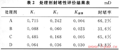 實驗中采用代號為A、B、C、D的4種處理劑,在3.5MPa循環(huán)壓力下對取自井下同一深度的巖心進(jìn)行了封堵效果測試,結(jié)果見表2。
