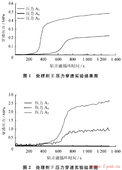 實驗采用處理劑E、F對同一深度的井下巖心進(jìn)行了壓力穿透測試,結(jié)果見圖1、2。