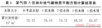 根據(jù)圖3采用常規(guī)物質(zhì)平衡法計(jì)算得到A區(qū)塊的動(dòng)態(tài)控制儲(chǔ)量為475.88×108m3,其動(dòng)態(tài)控制儲(chǔ)量遠(yuǎn)遠(yuǎn)大于A區(qū)地質(zhì)儲(chǔ)量,出現(xiàn)“超百”現(xiàn)象,不符合常理。分析認(rèn)為:該區(qū)塊與B區(qū)塊間存在相互補(bǔ)給和外溢漏失的情況,B區(qū)塊和A區(qū)塊相鄰并由一條斷層分隔,B區(qū)塊后期加鉆1口井測(cè)壓顯示地層壓力已降至27MPa,說明該區(qū)塊已被動(dòng)用(即產(chǎn)生了外溢)。應(yīng)用上述建立的補(bǔ)給氣藏物質(zhì)平衡方程可以計(jì)算收益區(qū)塊A區(qū)塊補(bǔ)給量的大小,其計(jì)算結(jié)果見表1。