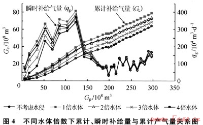 由圖4所預(yù)測(cè)的瞬時(shí)補(bǔ)給氣量顯示,氣田開采初期僅有A區(qū)塊開采,采氣速度迅速上升到4.5%,瞬時(shí)補(bǔ)給量(qg)也快速上升達(dá)到400×104m3/d;隨后由于氣田其他區(qū)塊投入開采,適當(dāng)調(diào)低了A區(qū)塊的采氣速度(維持在2.5%),瞬時(shí)補(bǔ)給氣量也降到120×104m3/d左右。采氣速度大小直接關(guān)系著地層壓力的降低幅度,因此,區(qū)塊間的壓力差是影響氣竄量大小的重要因素。