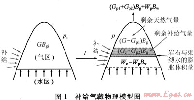 1936年,Schilthus首先推導(dǎo)出體積物質(zhì)平衡方程,此方法可以簡單有效的估算地層內(nèi)原始?xì)怏w和氣藏枯竭各階段天然氣儲(chǔ)量,是油氣藏動(dòng)態(tài)分析的一種標(biāo)準(zhǔn)的油氣藏丁程工具。筆者借鑒物質(zhì)平衡原理[2,13~15],將氣藏模擬為單獨(dú)儲(chǔ)罐體,并考慮有外來天然氣及水體通過薄的可滲透邊界不斷流入氣藏的情況下建立新的補(bǔ)給氣藏物理模型(圖1)。