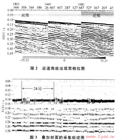 在海上三維采集中,由于海上拖纜特殊的采集方式,觀測(cè)系統(tǒng)因素除了陸上采集的觀測(cè)系統(tǒng)因素(激發(fā)和接收線距、寬方位和窄方位、覆蓋次數(shù)、方位角、炮檢距和源致線性干擾)外,還有因震源、電纜檢波點(diǎn)位置都處于相對(duì)運(yùn)動(dòng)狀態(tài)而帶來(lái)的其獨(dú)特影響。非觀測(cè)系統(tǒng)因素則包括了潮汐、水溫、含鹽度、水流方向、洋流、風(fēng)力、采集工區(qū)的水深、氣槍容量、氣槍壓力的變化、工區(qū)的地質(zhì)條件以及出于經(jīng)濟(jì)方面的考慮海上拖纜采集以轉(zhuǎn)圈的采集方式等多方面的影響。在對(duì)文昌區(qū)數(shù)據(jù)進(jìn)行檢查與分析時(shí),通過(guò)逐纜抽取地震數(shù)據(jù)近道檢查可以看到,通常遠(yuǎn)纜采集質(zhì)量較差,而且接收到的能量與近纜是有差異的。局部區(qū)域在遠(yuǎn)纜近道顯示上的海底甚至出現(xiàn)雙相位(圖2),造成疊加數(shù)據(jù)體每隔24道(與處理面元有關(guān))海底成像不好出現(xiàn)嚴(yán)重的采集痕跡(圖3)。經(jīng)分析,這種現(xiàn)象受水深及采集時(shí)的最小偏移距的共同影響,在水深100m左右的工區(qū)中這種遠(yuǎn)纜出現(xiàn)雙相位的現(xiàn)象特別明顯,而水深超過(guò)120m后遠(yuǎn)纜出現(xiàn)雙相位的情況就沒有那么明顯了,在水深小于50m時(shí),地震數(shù)據(jù)體的海底基本上不成像。