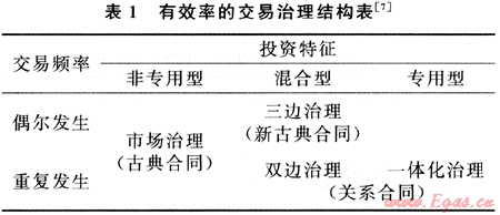 在選擇和設(shè)計(jì)交易治理機(jī)制的時(shí)候,交易者面臨“有限理性困境”和“機(jī)會(huì)主義威脅”兩者之間的持久沖突[6]。交易成本理論提出了有效的交易治理模式:市場治理(非專用型的,通過市場自由選擇)、一體化治理(專用性很強(qiáng),層級(jí)管理的效率最高)、關(guān)系合同治理(介于兩者之間的關(guān)系合同),如表1所示。