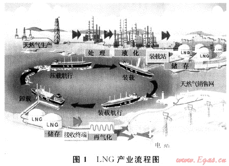 油氣資源開發(fā)利用是一個(gè)產(chǎn)業(yè)鏈,其流程如圖1,源頭是油氣田的勘探和開發(fā)。從國外購買油氣資源不是一個(gè)簡單的貿(mào)易問題[3]。廣東LNG項(xiàng)目,其確定上游供應(yīng)商、接收站和輸氣管網(wǎng)建設(shè)、LNG船制造、下游電廠建造及居民用氣改造等,都在統(tǒng)一的計(jì)劃安排下,同步實(shí)施。廣東LNG項(xiàng)目的氣源供應(yīng)商招標(biāo),業(yè)主向澳大利亞、馬來西亞、卡塔爾、印度尼西亞、俄羅斯等國的7家公司發(fā)出邀請(qǐng),澳大利亞天然氣公司(ALNG)中標(biāo)最終成為廣東LNG的供應(yīng)方,并且自動(dòng)成為廣東LNG運(yùn)輸項(xiàng)目外商合作伙伴,ALNG推薦殼牌(Shell)公司參加并協(xié)助商船建造工作。國內(nèi)第一條LNG專用船由上海滬東船廠和法國大西洋船廠(Aker yards)合作承建,招商局集團(tuán)與中遠(yuǎn)集團(tuán)合資組建中國第一支LNG船隊(duì),承擔(dān)廣東LNG項(xiàng)目的液化天然氣運(yùn)輸;廣東LNG的接收站及外輸管網(wǎng),則由中海油與BP石油公司牽頭,吸納了國內(nèi)部分燃?xì)馄髽I(yè),發(fā)起成立廣東大鵬LNG公司,負(fù)責(zé)接收站和輸氣管網(wǎng)的建設(shè)和運(yùn)營。