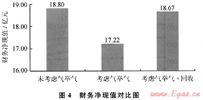 經(jīng)濟(jì)指標(biāo)為財務(wù)內(nèi)部收益率,財務(wù)凈現(xiàn)值,靜態(tài)投資回收期,動態(tài)投資回收期,投資利潤率和投資利稅率[6]。根據(jù)經(jīng)濟(jì)指標(biāo)得出:3種情況的財務(wù)內(nèi)部收益率均大于30%,大于石油財政基準(zhǔn)收益率12%;若增添壓縮機(jī),則投資成本能夠在1a內(nèi)收回;靜態(tài)和動態(tài)投資回收期均小于1a。如圖4,添加壓縮機(jī)回收低壓氣比目前壓縮機(jī)生產(chǎn)的財務(wù)凈現(xiàn)值能多獲得1.45億元。
