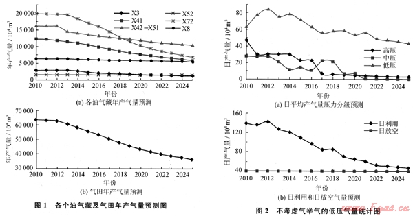 2) 不考慮氣舉氣時,目前的壓縮機(jī)能夠滿足氣田低壓氣回收的要求,2010~2025年可回收低壓氣為35.92×108m3;考慮氣舉氣時,需在2010~2016年增添壓縮機(jī),若添置壓縮能力為20×104m3/d的壓縮機(jī),則2011年、2012年和2014年需要2臺,其他時間只需1臺,預(yù)計可回收低壓氣47.26×108m3。