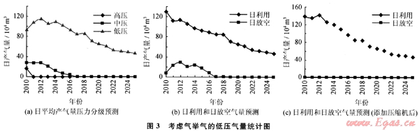 出于經(jīng)濟(jì)考慮,日產(chǎn)氣量低于1×104m3的低壓氣不考慮回收,如果統(tǒng)一添加壓縮能力為20×104m3/d的壓縮機(jī),那么添置情況為2010年1臺,2011年和2012年2臺,2013年1臺,2014年2臺,2015年和2016年1臺。添加壓縮機(jī)之后,日利用和日放空氣量預(yù)測情況如圖3-c,預(yù)計到2025年累計可回收低壓氣為47.26×108m3,比放空方案多回收4.79×104m3。