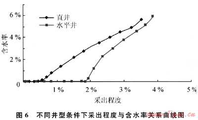 對于同一個邊底水油藏,采用不同的井型邊底水推進的速度是不一樣的。對于強底水情況,模擬了圓形地層中心1口直井或1口水平井的開采情況,其采出程度與含水率關(guān)系曲線見圖6。從圖中可以看出,水平井的無水開采期比直井的無水開采期長得多,水平井的采出程度也比直井高。因此同等情況下,水平井的開發(fā)效果要好于直井的開發(fā)效果。