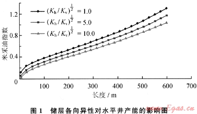 通過對水平井擬三維產(chǎn)能方程進行離散得出了不同各向異性系數(shù)(水平滲透率與垂向滲透率比值的開方)下,水平井長度和米采油指數(shù)的關(guān)系。