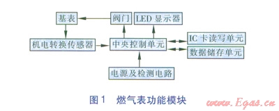 我公司研發(fā)的燃?xì)獗砉δ苣K組成見(jiàn)圖1。中央控制單元是該燃?xì)獗淼暮诵?。通過(guò)Ic卡讀寫(xiě)單元,使用異常流量參數(shù)IC設(shè)置卡或無(wú)線形式將燃?xì)猱惓A髁繀?shù)傳入燃?xì)獗淼闹醒肟刂茊卧?,通過(guò)中央控制單元保存到數(shù)據(jù)儲(chǔ)存單元中,作為異常流量的判斷依據(jù)。當(dāng)前的瞬時(shí)流量數(shù)據(jù)從基表通過(guò)機(jī)電轉(zhuǎn)換傳感器讀入到中央控制單元后,由中央控制單元計(jì)算出當(dāng)前表內(nèi)的瞬時(shí)流量值并與數(shù)據(jù)儲(chǔ)存單元中的異常流量參數(shù)范圍進(jìn)行比較。當(dāng)確認(rèn)流量異常時(shí),中央控制單元發(fā)出關(guān)閥操作信號(hào)給閥門,閥門關(guān)閉,同時(shí)向顯示器輸出異常流量信號(hào),顯示器顯示異常提示[1]。