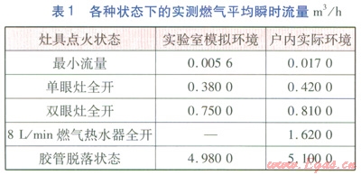 基表型號(hào)為Gl.6,氣源為天然氣,壓力為3000Pa,燃具在各種狀態(tài)下測(cè)定的瞬時(shí)流量經(jīng)整理后的平均值見(jiàn)表1。
