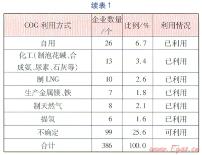 截至2012年中,符合《焦化行業(yè)準(zhǔn)入條件》的企業(yè)共計(jì)6個批次,其利用情況主要為制甲醇、發(fā)電、外供(用途不確定)、供熱、供城市燃?xì)饧白杂脦讉€方面。據(jù)西南化工研究設(shè)計(jì)院有限公司所提供至2012年共計(jì)6個批次獲得準(zhǔn)入條件企業(yè)的利用情況,分析整理得到焦化企業(yè)COG利用情況(見表1)。