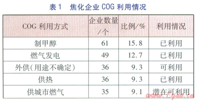 前述分析顯示,目前中國焦化企業(yè)中將COG用于外供(用途不確定)、城市燃?xì)庖约澳壳安淮_定利用情況的l67家企業(yè)是COG可利用資源,這些企業(yè)主要分布在山西、河北、山東,分別有53、40、19家企業(yè);少量分布在河南、陜西、內(nèi)蒙古等地,分別有11、7、6家企業(yè)。2011年我國焦炭產(chǎn)量前三名省份為山西、河北、山東,焦炭產(chǎn)量分別為0.9×108、0.6×108、0.4×108t。從地域分布上看,COG可利用資源企業(yè)分布情況與焦炭產(chǎn)量分布情況相同,前三名均鎖定在山西、河北、山東,這也印證了COG是焦炭企業(yè)的重要副產(chǎn)品的特點(diǎn)。