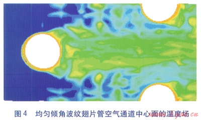 空氣進(jìn)口速度為4m/s時,兩種波紋翅片管空氣通道中心面的溫度場分別見圖4、5。由圖4、5可知,兩種波紋翅片管的溫度分布都很紊亂且成狹長帶狀。在迎風(fēng)側(cè),傾角漸增波紋翅片管空氣通道中心面空氣溫度上升得較快,且出口溫度高于均勻傾角波紋翅片管。這是由于傾角漸增波紋翅片結(jié)構(gòu)加強(qiáng)了氣流擾動,從而強(qiáng)化了換熱。兩種波紋翅片管的共同點是:在迎風(fēng)側(cè),溫度場分布稠密,溫度上升較快,換熱較強(qiáng)烈;在背風(fēng)側(cè),溫度場分布稀疏,溫度變化較小,換熱較平緩。