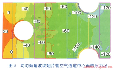摘 要:介紹均勻傾角波紋翅片管、傾角漸增波紋翅片管的結(jié)構(gòu)。采用FLUENT軟件,對兩種波紋翅片管空氣流道中心面上的溫度場、壓力場、換熱量、阻力進(jìn)行了數(shù)值模擬。