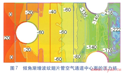 空氣進(jìn)口速度為4m/s時,兩種波紋翅片管空氣通道中心面的壓力(表壓)場分別見圖6、7,圖中數(shù)值單位為Pa。由圖6、7可知,兩種波紋翅片管的壓力分布均比較紊亂。傾角漸增波紋翅片管空氣通道中心面的壓力降要大于均勻傾角波紋翅片管,且隨著翅片傾角的增大,等壓線分布更加稠密。原因是傾角漸增波紋翅片結(jié)構(gòu)對流體的阻滯和擾動作用都較大,阻力比均勻傾角波紋翅片管大。