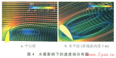 根據(jù)CFD模型計(jì)算的一般步驟,在做瞬態(tài)計(jì)算之前,首先應(yīng)求解穩(wěn)態(tài)的速度場[14],計(jì)算結(jié)果如圖4所示,在水幕的前后均有渦旋生成,水幕的上風(fēng)向側(cè)底部,有一個(gè)尺寸較小的渦旋,在水幕的下風(fēng)向測,可以很清晰的觀察到,無論在豎直方向上還是水平方向上,均有渦旋生成,并且尺寸較大,豎直方向上的渦旋會將穿過水幕后的氣體向上卷吸,而水平方向上的兩側(cè)渦旋,能夠?qū)⒋┻^水幕的氣體向中心線處收攏,對LNG蒸氣云團(tuán)擴(kuò)散產(chǎn)生較大影響。