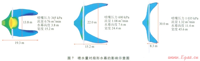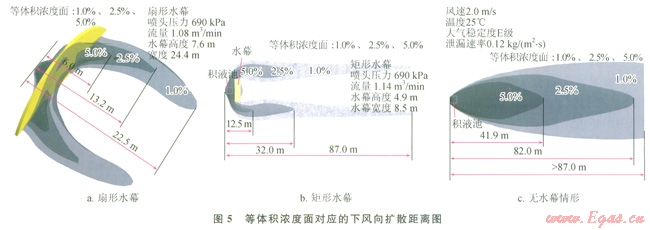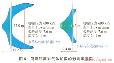 下面對扇形水幕的參數(shù)進(jìn)行研究,包括噴水量和水幕和擴(kuò)散源之間的間隔,這二者是影響水幕阻擋效果的主要因素。圖7顯示了不同水流量下,水幕對氣體擴(kuò)散的影響,在相同的大氣條件下,水流量越大,形成的水幕尺寸也就越大。當(dāng)扇形水幕流量為l.32m3/min,壓力1035kPa時(shí),水幕高度為11.4m,寬度45.6m,LNG蒸發(fā)氣體下風(fēng)向擴(kuò)散的安全距離為8.3m。
