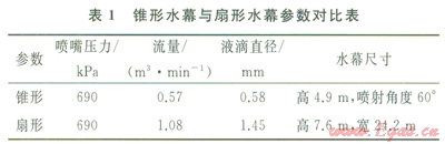 表l[11-12]顯示了兩種水幕在相同壓力和管徑條件下,水幕的流量、液滴直徑以及水幕尺寸的對比,可以看出錐形水幕較扇形水幕流量少、液滴直徑小,并且水幕高度小,約兩個(gè)錐形水幕的流量等于一個(gè)扇形水幕的流量。為了將兩種水幕對LNG蒸氣云擴(kuò)散的阻擋效果進(jìn)行對比,可以將多個(gè)同時(shí)作用的錐形水幕近似看作矩形水幕,相鄰錐形水幕的重疊區(qū)域?yàn)樽陨沓叽绲囊话搿?span lang="EN-US">