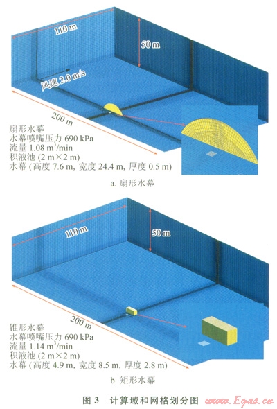對比相同壓力、相同流量下的扇形水幕與矩形水幕,根據(jù)表1中兩種水幕的壓力和流量,兩個(gè)錐形水幕的流量與一個(gè)扇形水幕的流量近似相等,并可以近似地看成一個(gè)矩形水幕。對于上述泄漏場景下的擴(kuò)散情形,分別采用扇形水幕和矩形水幕進(jìn)行阻隔氣體,筆者對兩種水幕進(jìn)行CFD模擬計(jì)算,計(jì)算域和網(wǎng)格劃分如圖3所示。由于計(jì)算域?yàn)閷ΨQ區(qū)域,所以為了節(jié)省計(jì)算資源,縮短計(jì)算時(shí)間,求解時(shí)僅對計(jì)算區(qū)域的一半進(jìn)行計(jì)算[14]。
