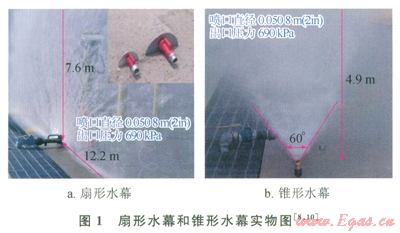 在LNG場站消防系統(tǒng)中,經(jīng)常會用到兩種噴射水幕,即扇形水幕(Flat Fan Spray Water Curtain)和錐形水幕(Cone Spray Water Curtain) [8,10](如圖l)。對于扇形噴射水幕的形成,工業(yè)中經(jīng)常采用如圖1-a的裝置,將高壓水柱噴射到金屬擋板上,水柱沿?fù)醢迳闲?,呈扇形或者半圓形展開,一般扇形水幕為可移動式水幕;錐形水幕則是噴頭由下向上噴出形成,呈一個(gè)倒立的錐形,一般情況下需要數(shù)個(gè)噴頭并排一起工作。