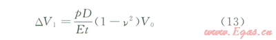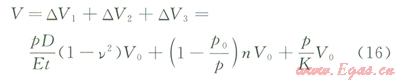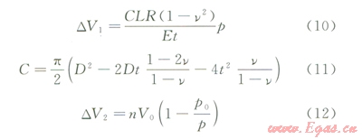 實踐中,對于式(10),由于徑向為管道壁厚方向,對于大口徑薄壁管,擘厚變化引起的管道體積變化較小,以規(guī)格為l219×22mm規(guī)格的管道為例,經(jīng)測算,僅為DVl的5%,若考慮空氣、水的壓縮性,該比例還將大大降低。因此,本文將該壁厚變化引起的體積變化忽略,得到DVl表達(dá)式為: