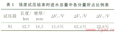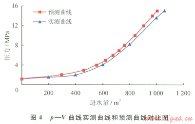 同時,分析預(yù)測曲線中V的組成,其中DV1、DV2、DV3各自所占的比例見表l,由水壓縮性計算而得的DV3,其值超過DV1,是試壓進(jìn)水量的一個重要因素,不可在計算中忽略。